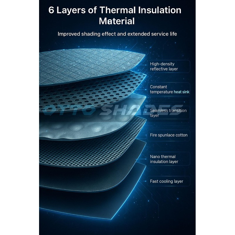 6 layer Thickness 210T reflective polyester Material: Blocks thermal radiation and provides better shading effect, keeping the interior of the car cool.