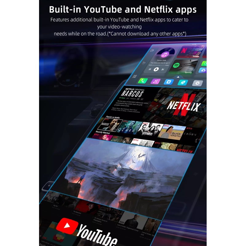 - 【Pre-installed YouTube & Netflix & Spotify & IPTV】Our CarPlay AI box has a built-in Android system, pre-installed YouTube & Netflix & Spotify & IPTV streaming apps, so after connecting to the car's Wi-Fi or mobile hotspot, you can quickly log in and watch your favourite videos. It also supports split screen. Its advanced features include wireless mirror link, voice control (Siri, Google), etc. NOTE: It DOESN'T support downloading apps, the car must have the touch screen.