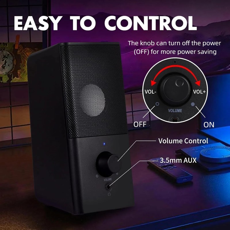 - 【One Knob Volume Control】Integrated volume up and volume down buttons (Min to Max) to offer you simple and accurately listening and hearing gaming and movie-watching experience. The cable between the desktop speakers is 47 inches long, and can be placed on either side of the monitor or desktop/laptop/pc/tablet.