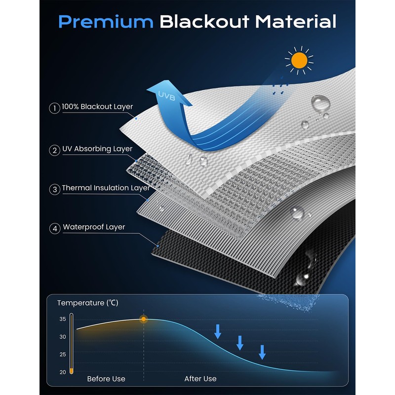 Don't let light disturb your sleep anymore. OTUOER's portable blackout curtains offer 100% blackout, thanks to their high-quality polyester material with a reflective silver layer. This not only blocks out light but also deflects UV rays and heat, creating an optimal sleep environment.Installing these shades is a breeze with our enhanced hook and loop fastener system—no tools, no drilling, just perfect fit.