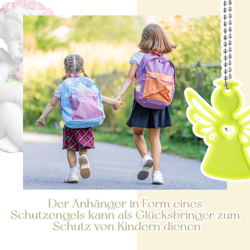 - High Quality Materials Our reflective angel keychain is made of high quality plastic, which is not only durable, but also effectively maintains the beauty and elegance of the angel shape. The angel is reflective on both sides and has sturdy eyelets and is therefore an ideal gift for children and adults to increase your child's visibility in road traffic and on the way to school, for example as a reflective guardian angel on the school bag