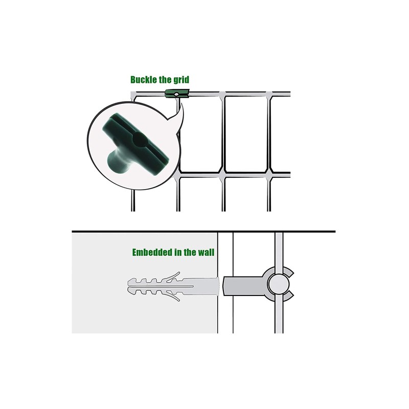 - T-Clip and Wall Anchor made of PP matericals, attractive and durable. Fit for most sizes of solid mesh about 2-3mm/0.08-0.12inch wires.