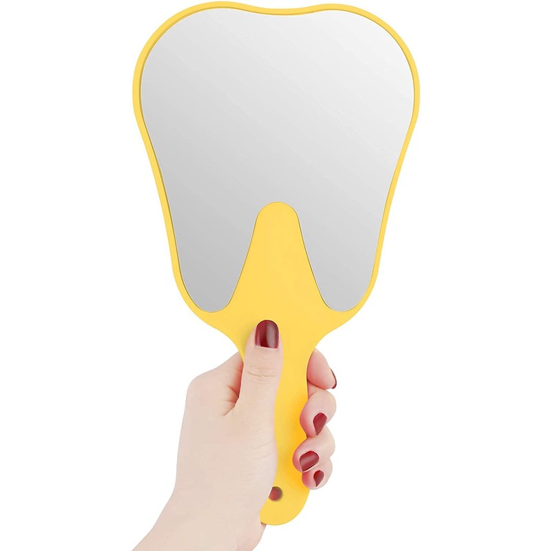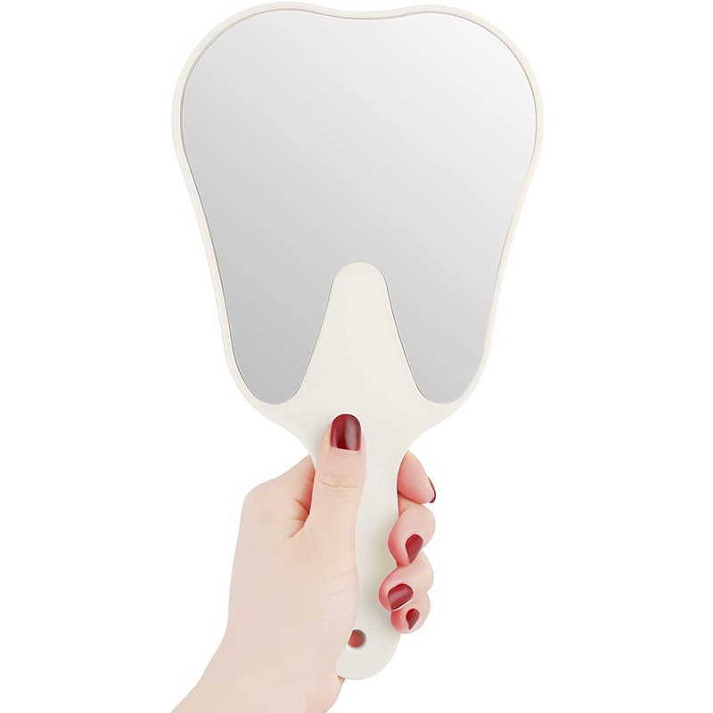 - Espejos de mano con diseño de dientes bonitos. Como espejo de maquillaje, un producto esencial en el baño.