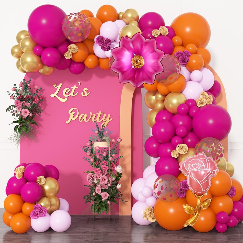 - Hot Pink & Orange Balloons Kit: Our pink and orange balloon arch comes with 175 balloons and accessories, including 4pcs 18in latex balloons (hot pink/orange), 5 confetti balloons, 15pcs 12in balloons(hot pink/orange/macaron pink), 80pcs 10in balloons(hot pink/orange/macaron pink/metallic gold), 65pcs 5in balloons((hot pink/orange/macaron pink/metallic gold), 1pcs 18in sunflower aluminum film balloon, 1pcs 35 * 19in rose aluminum film balloon, and 4 balloon tools. Numerous options for value.