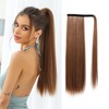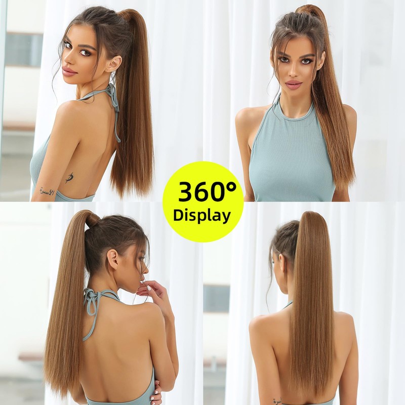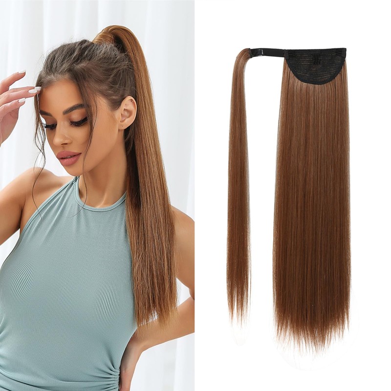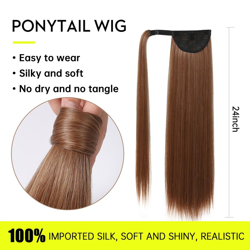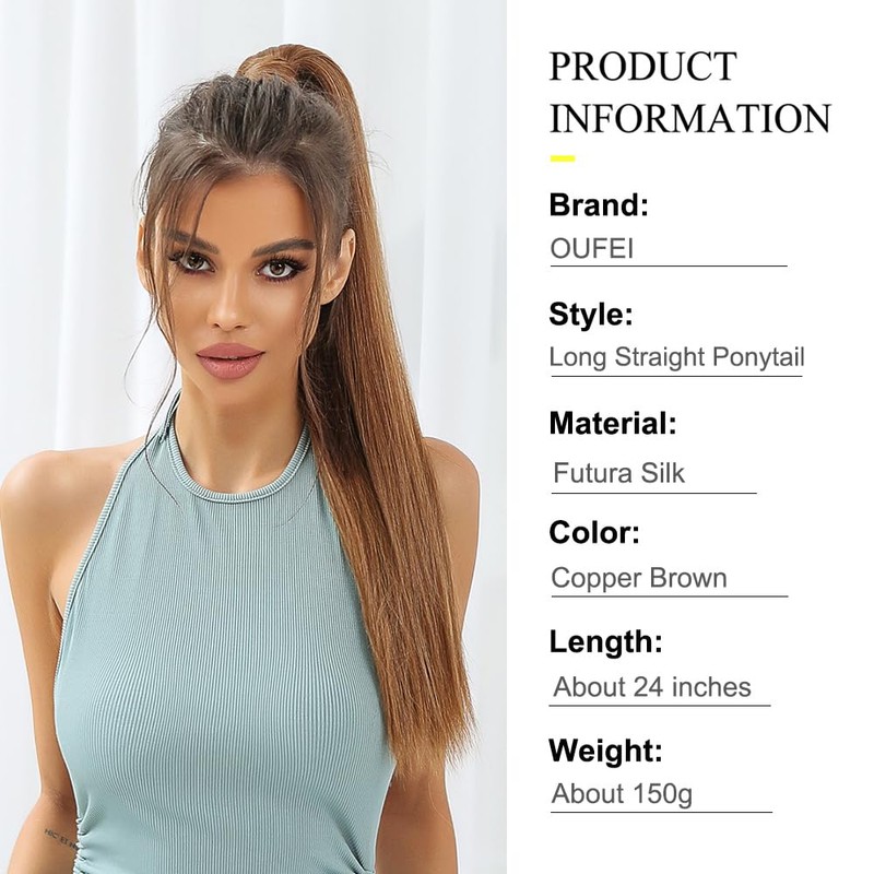 OUFEI Ponytail Extension Copper Brown Highlights Long Straight Synthetic Extensions Braid Velcro Natural Ponytail Hairpiece for Women 24 Inches