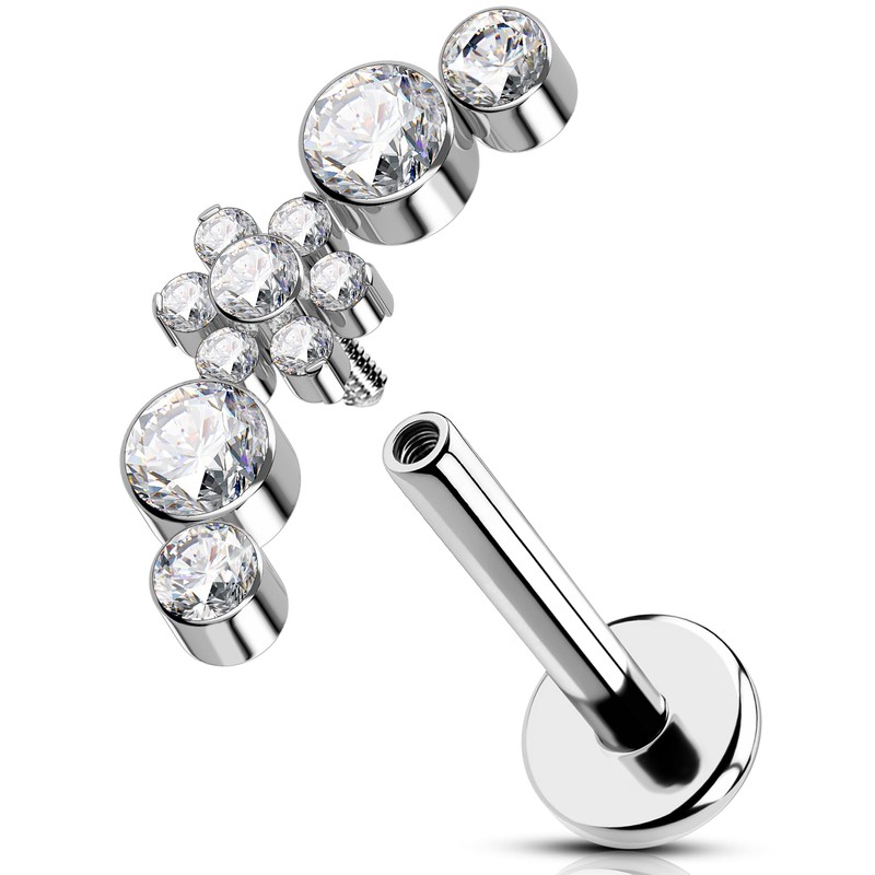 This refined 16G/1.2mm curved lip stud showcases a delicate floral pattern with sparkling cubic zirconia detailing, crafted from high-quality G23 titanium. The 8mm design provides a comfortable, secure fit for most lip piercings while maintaining a sleek profile. The lightweight titanium construction ensures lasting wear without tarnishing, complemented by precisely arranged stones that catch the light beautifully. Its botanical-inspired silhouette offers a subtle yet distinctive aesthetic, perfect for adding a touch of understated elegance to your everyday style or special occasions. The combination of durable materials and graceful design creates a practical yet sophisticated piercing option.
