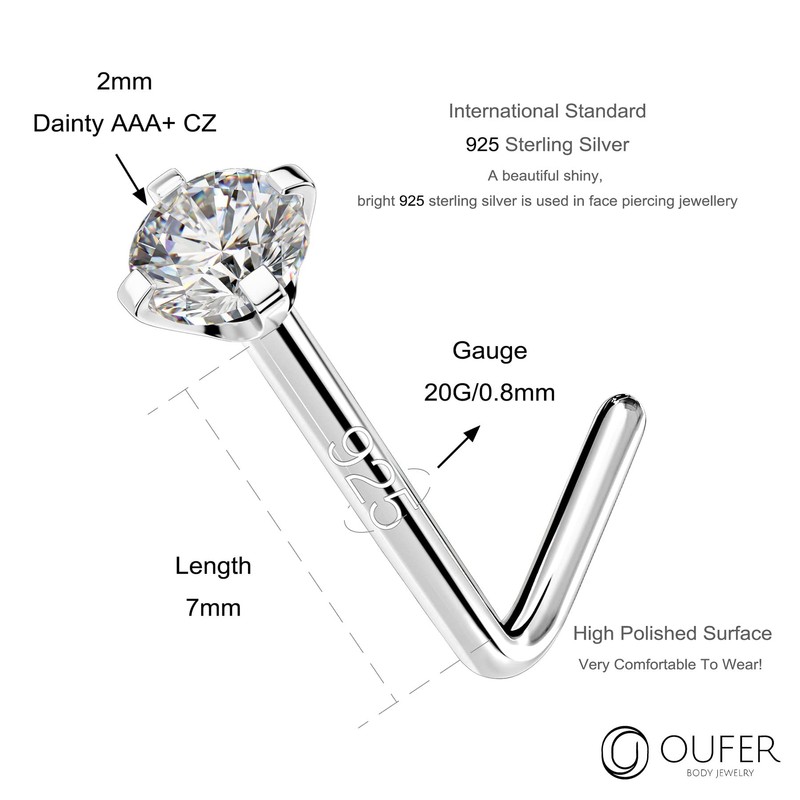 - Classic nose piercing, silver 925: 1 x solid sterling silver nose piercing with small shiny CZ L-shaped/S-shaped. You can wear it everyday, it's comfortable and looks stunning.