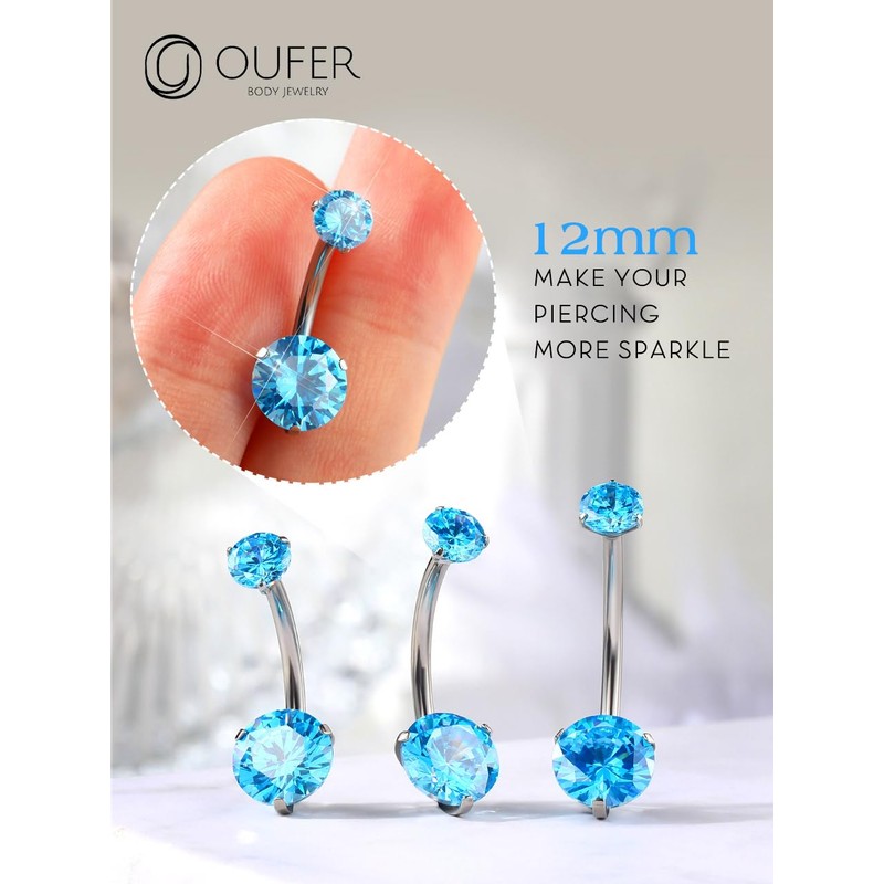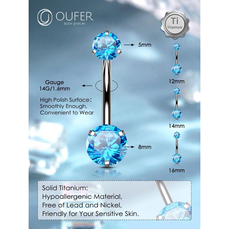 - Style of navel piercing: you will receive 1 x 14G titanium belly piercing with two round aqua cubic zirconia
