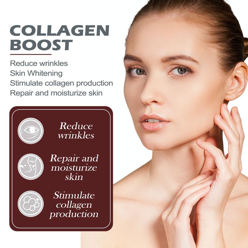 Our collagen anti-aging serum contains hyaluronic acid, niacinamide and vitamin C. It can whiten, reduce wrinkles, repair and moisturize the skin, and keep the skin healthy. Its use method is very simple: after cleansing, apply appropriate amount of this product evenly on the face, gently massage for 3-5 minutes until the skin is completely absorbed. And it can fight wrinkles and repair dark spots.