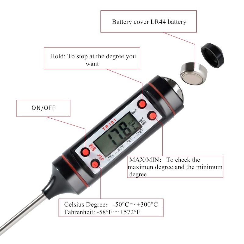 - 【Dringend Benötigtes Küchenutensil】Besteht aus 304 Edelstahl. Der Thermometer liefert immer genaue und verlässliche Ergebnisse, auch die Reinigung total praktisch. Die Batterie ist bei diesem Produkt mit dabei. Wir bieten eine 18-monatige-Qarantie für den Thermometer an, wenn es Problem mit dem Produkt gibt, einfach mit uns durch Email kontaktieren für Austauschen oder Erstattung.