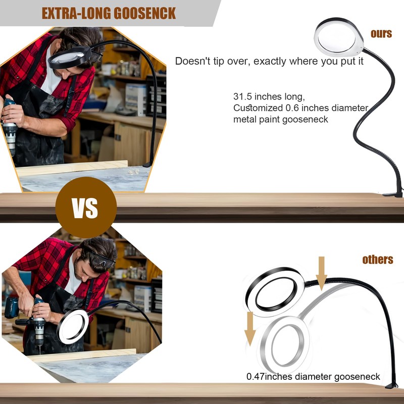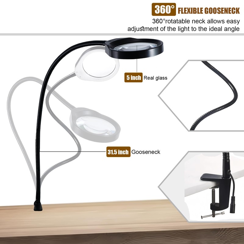 - LED magnifying lamp 360° adjustable gooseneck & ring light design, easily to direct the light wherever you want for best viewing. with a 4ft convenient USB charging cord, able to plug into any available USB port, no more worry about the distance between the clip lamp and socket.
