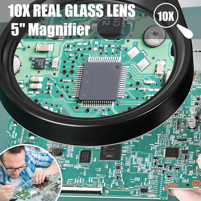 - 10x lighted magnifying glass is professionally designed with a 5" optically lens, which can provides a clear magnifying view without distortion. Up to 10x magnification make reading, sewing, repairing, carving, manicure, soldering ect easier.
