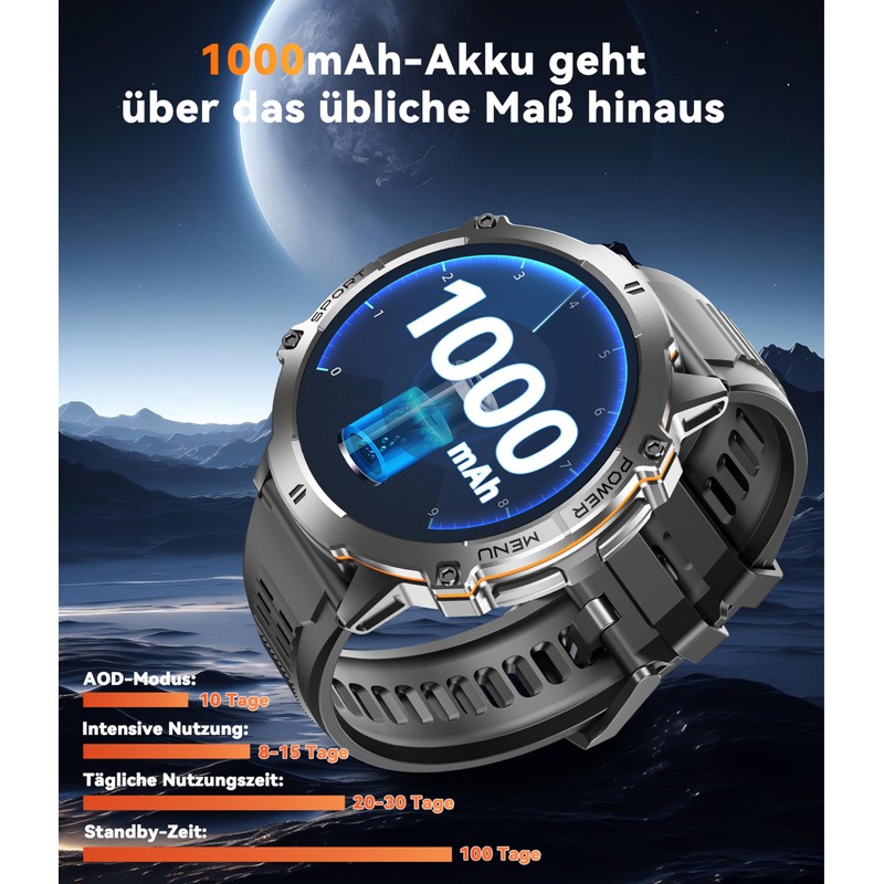 - Smartwatch mit der größten Akkukapazität von 1000mAh. Als professioneller Hersteller von Hochleistungsakkus ist die OUKITEL BT13 uhren mit einem 1000mAh-Hochleistungsakku ausgestattet, der die größte Akkukapazität einer Smartwatch auf dem Markt darstellt. Die Standby-Zeit beträgt bis zu 100 Tage und kann bis zu 30 Tage dauern. Nie wieder Sorgen über häufiges Aufladen – perfekt für den aktiven Lebensstil!