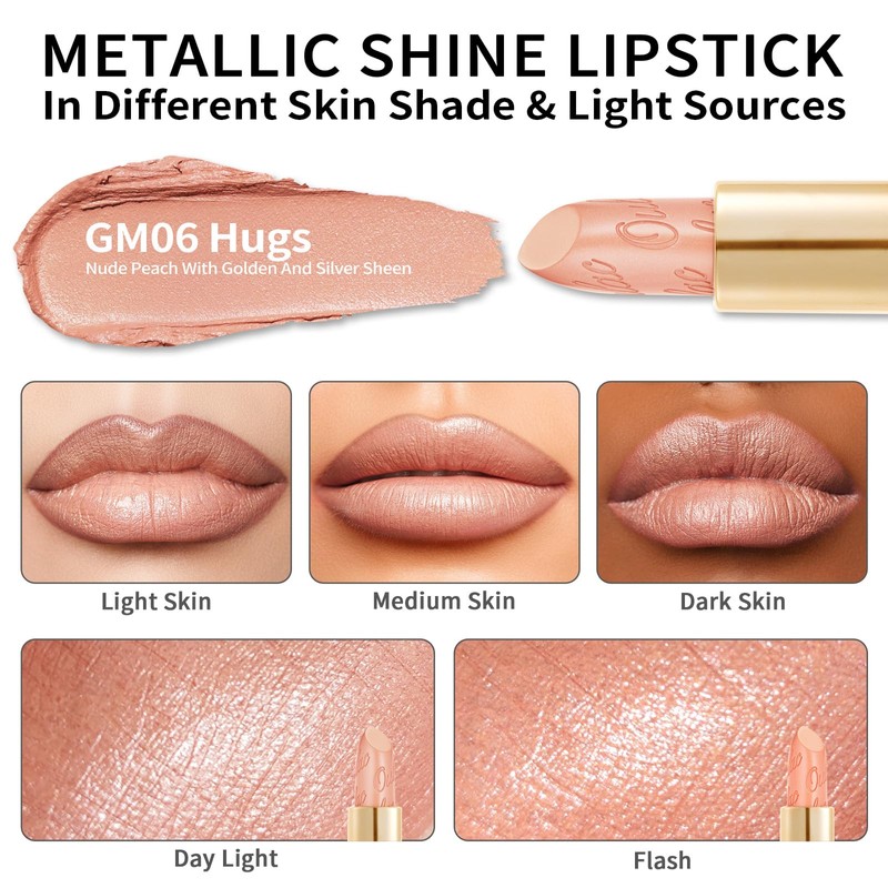 OULAC Matte Lipstick Metallic Shiny, Nude Peach Long-Lasting Glitter Lipsticks, Moisture and Shine for the Lips, Intense Colour, Fine Texture, Vegan, 4.3 g (GM06) Hugs