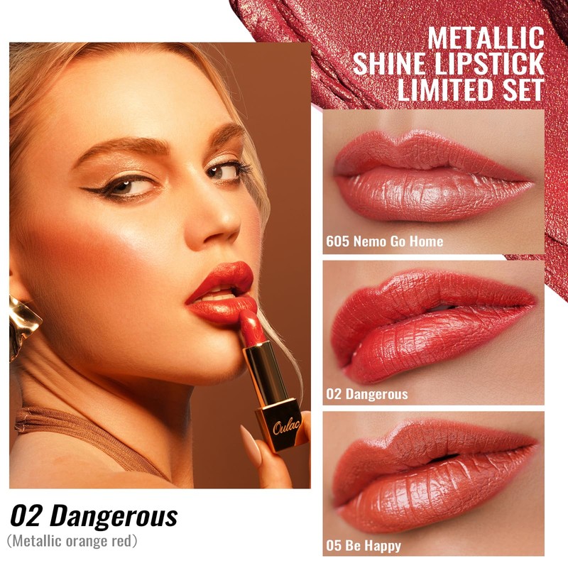 Oulac Metallic Orange Lipstick Set 3PCS, Comfortable Creamy Texture, Smooth No Grainy Feeling, Vegan & Gluten Free, Full-Coverage Lip Makeup, 3 X 4.3 g, 605+02+05