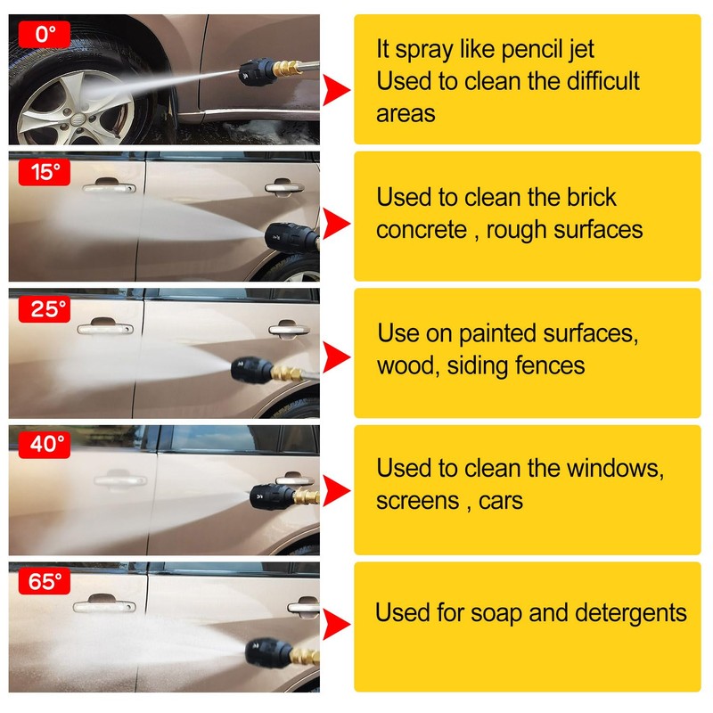 - Five in one quick connection: there are five different positions of the nozzle of the high-pressure cleaner gun. 0°, 15°, 30°, 45°, 60°. Choose an angle suitable for cleaning tasks according to your cleaning goals.