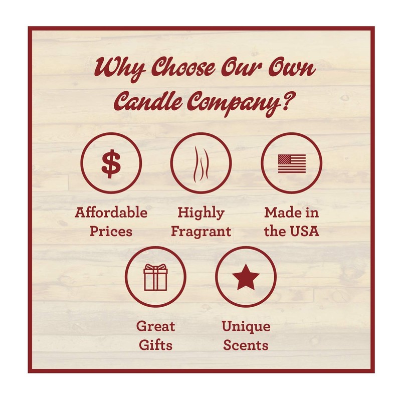 Our Own Candle Company was started because we could not find a candle that had all the qualities we were looking for: no wasted wax, a great long lasting scent that spreads throughout the house, and a candle that lasts a very long time. We worked hard and did a lot of experimentation until we found just the right combination of ingredients to give us what we wanted.