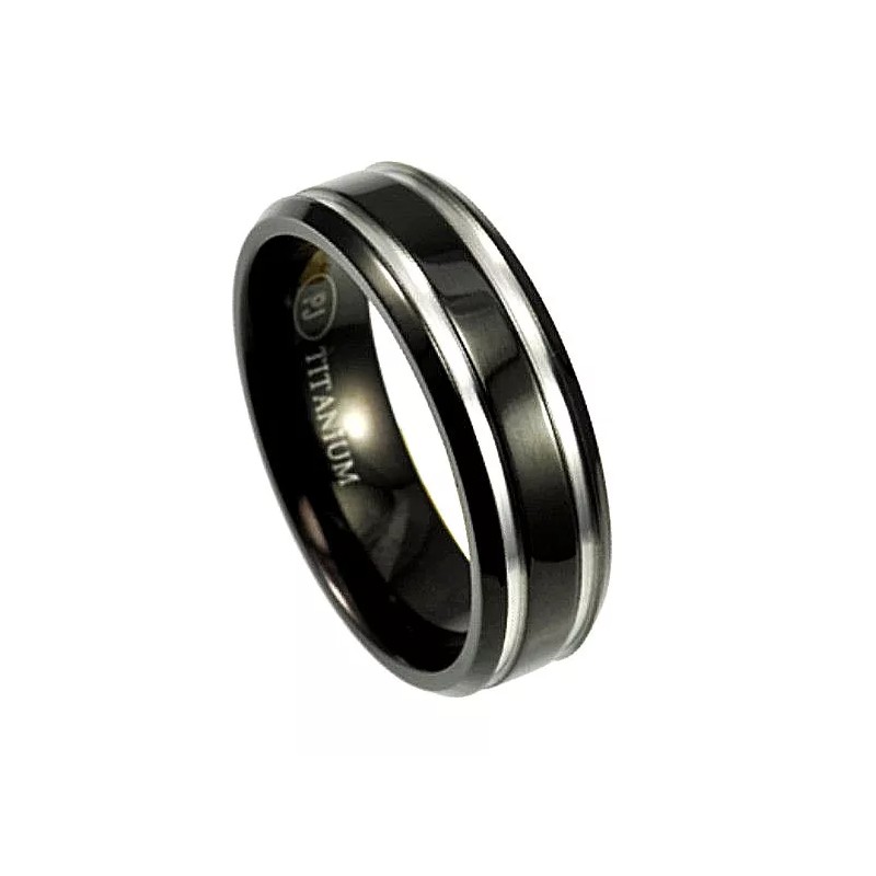 Our Own TITANIUM Black Plated BEVELED RING BAND with Accent Grooves, size 8, in Gift Box