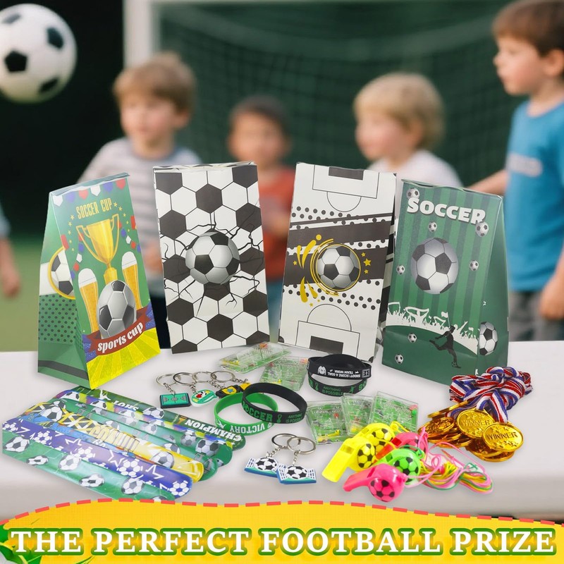 - Football party bags: includes whistle x 10 + bracelet x 10 (5 types x 2) + dad circle x 10 (10 different types) + medal x 10 + gift bag x 10 + marble labyrinth x 10 + key chain x 10 + stickers x 1 (1 set of 60 pieces). This set of football decorations is beautifully and uniquely designed and will add more attraction and fun to your party
