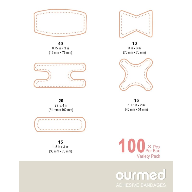 - Family Variety Packs for Joints: Ourmed Bandage variety pack contains 100 various shapes bandages snuging on your knuckle, knee, feet and fingertip. Each wound can receive precise and comprehensive protection.