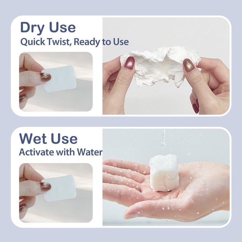 - [Dry & Wet Use — Instant Expand] Open dry by your hand or activate with water to a full 12x10 inch towel. Soft, durable, lint-free compressed towels in individual wraps deliver clean, single-use convenience and neat, sealed storage.