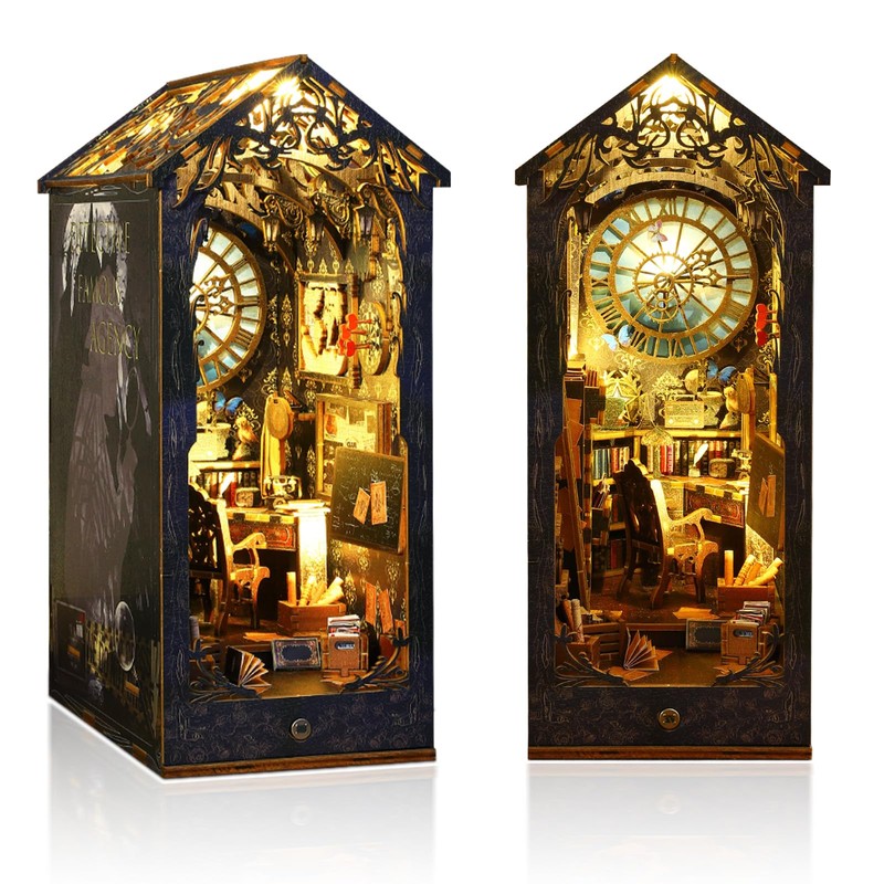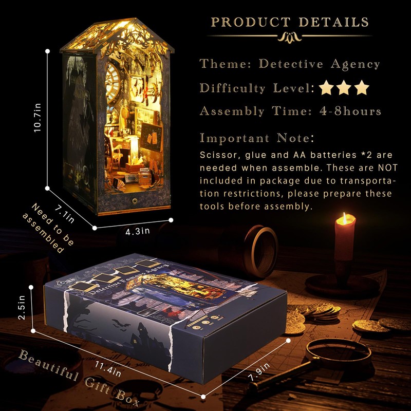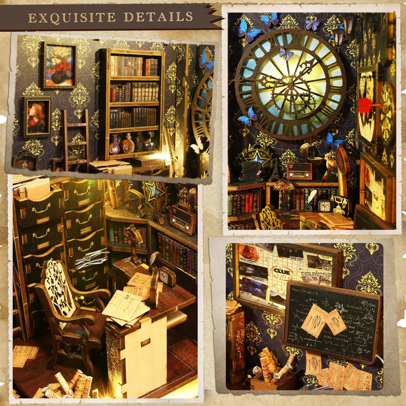 - UNIQUE DESIGN - Detective themed scene, classical design, exquisite objects and furniture. Build-in sensor LED light, every time you pass the book nook, the luminous miniature world will give you a good mood.