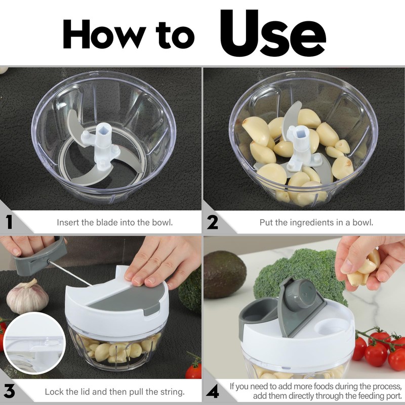 - Achieve food sizes by adjusting the number of string pulls: ten times for coarse chopping, fifteen times for medium and twenty or more for a smooth puree.