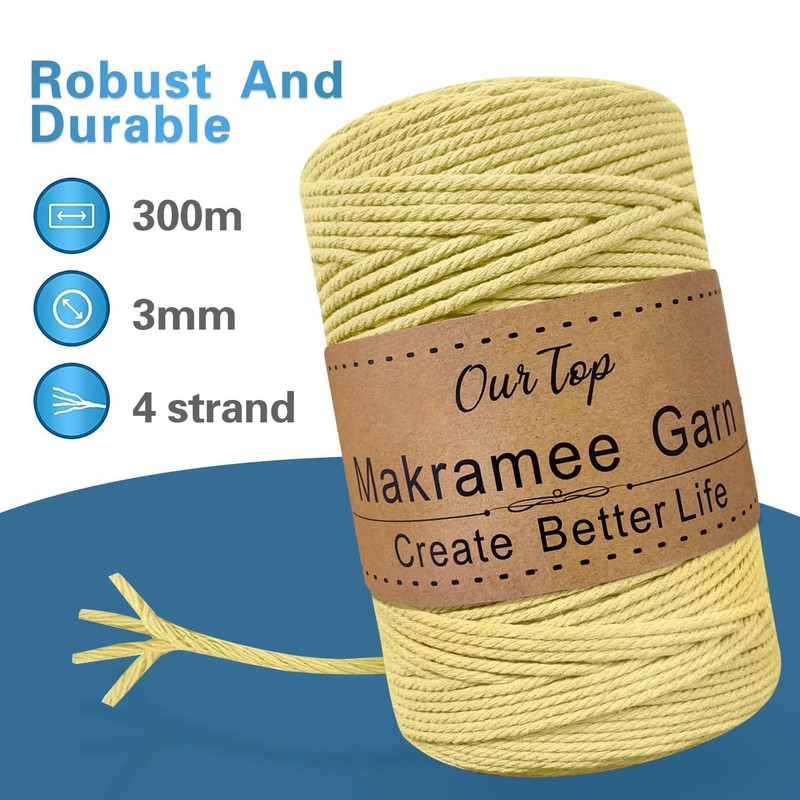 OurTop Premium Macrame Cord, 3mm x 300m Braided Macrame Rope Twisted Cord Yarn Macrame Yarn Thick Rope for Wall Hangings, Plant Hangers, DIY Crafts, Home Decorations, Gift Wrapping(Yellow)
