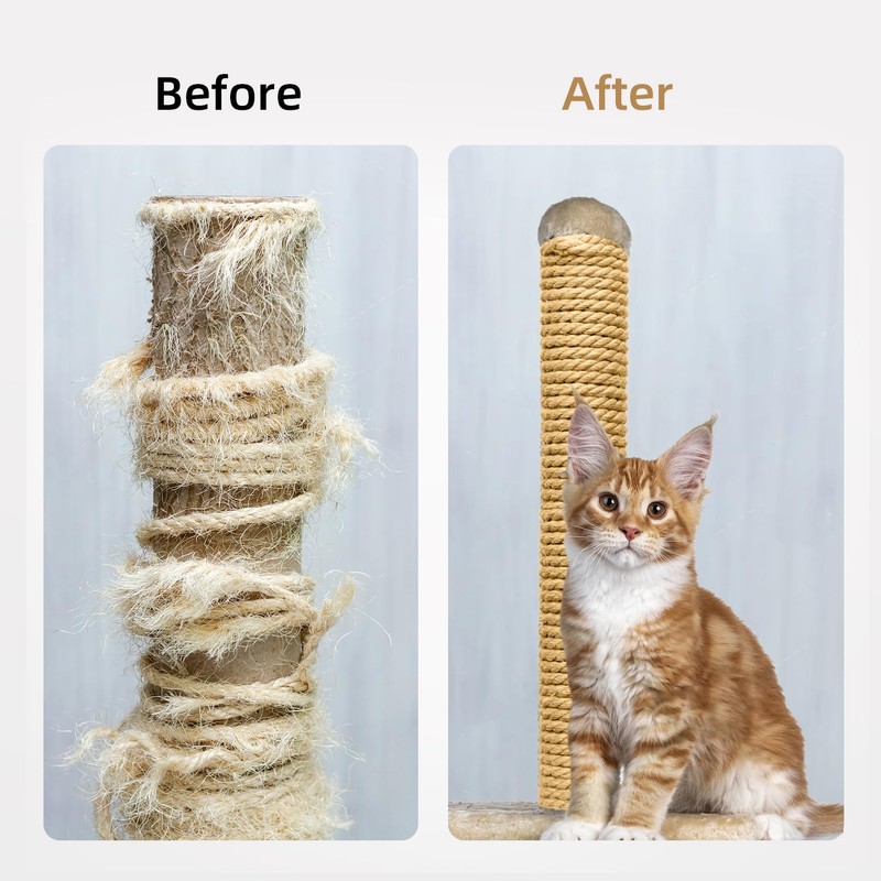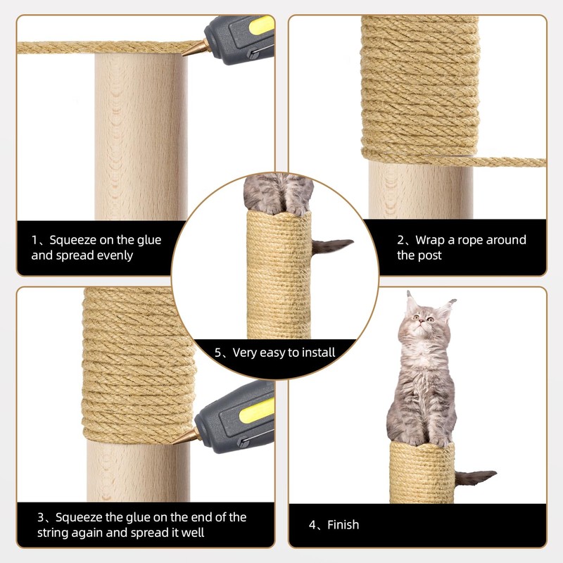 - Easy to install: you need a hot glue gun, you can first attach the rope for the cat scratching post with a hot glue gun or with nails, then wrap the cord around the desired length, tighten the cord, finally attach with a hot glue gun or a large pin. The rope is made from renewable raw materials, replacing a cat scratching post saves resources and of course money, compared to buying a whole cat furniture.