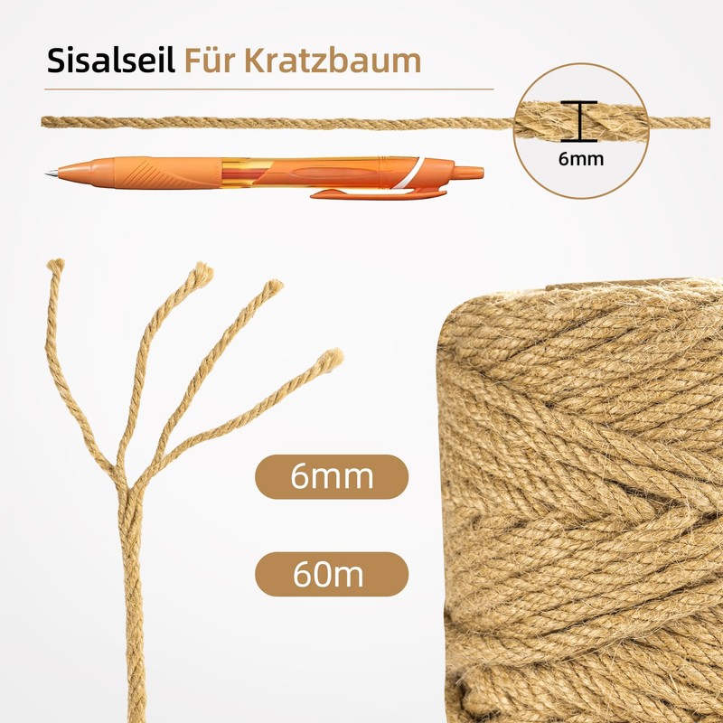 - Sisal rope for scratching post: sisal rope 60 metres on a roll, 6 mm diameter. Ideal for decorating homes, offices and gardens. It can also be used to make a variety of crafts