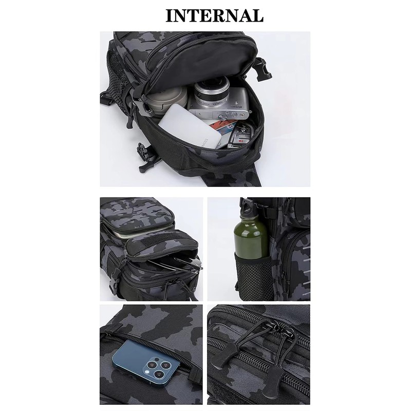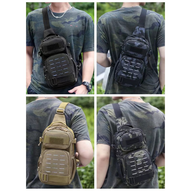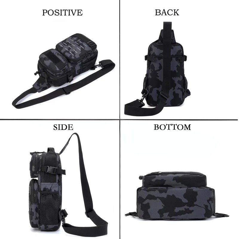 - Multi-pocket Small Shoulder Bag: The sling bag have a main bag and a fit pocket inside the main pocket, there are 2 pockets on the front of the molle backpack, the tactical backpack also has a pocket on the back, you can put personal item in it and prevent theft, there are two net pockets on both sides of the sling backpack for water cups, and the other pockets can also store mobile phones, keys, wallets, tissues, sunglasses, iPad mini, power banks, etc
