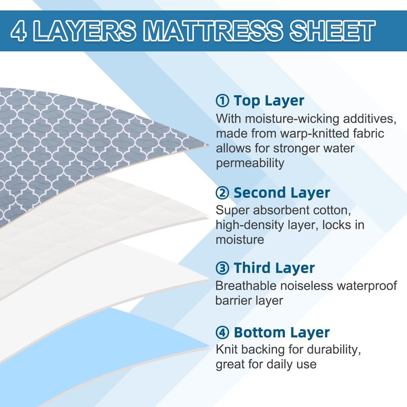 - Tamaño perfecto: nuestro protector de colchón con alas mide 34 x 54 pulgadas. Con generosas alas de 21 pulgadas para mantener la almohadilla de forma segura en su lugar. Se adapta a camas queen. Con 4 capas absorbentes y protectoras para mantener tus sábanas y cama secas y protegidas toda la noche mientras siguen siendo cómodas y seguras.