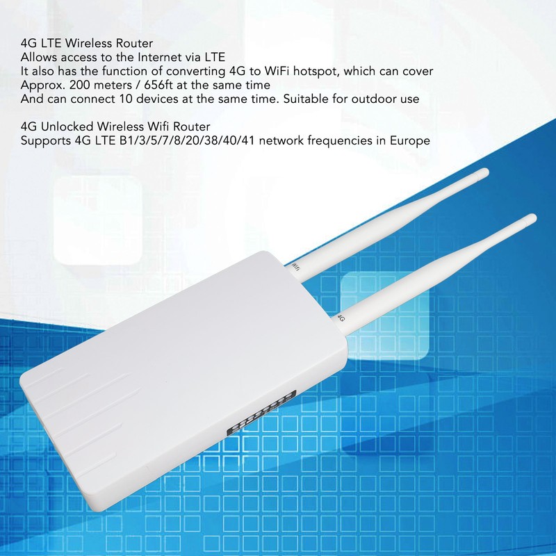 1、CONNECTS UP TO 10 DEVICES: 4G LTE wireless router that can access the Internet via LTE. It also has the ability to convert 4G into a WiFi hotspot that can cover up to 200 meters at the same time and can connect up to 10 devices at the same time. It is suitable for outdoor use. 2、WITH SIM CARD SLOT: WiFi mobile router is equipped with 1 LAN, 1 SIM card slot interface. It has a download speed of up to 150mbps, an upload speed of up to 50mbps, and a wireless transmission speed of 300mbps. effectively prevents co frequency interference, and the wifi signal transmission is stable. 3、IMPROVED SENSITIVITY: 2x 5dBi high gain detachable antennas improve the sensitivity of the router and improve the signal quality of 4G LTE and WiFi, which is helpful to establish WiFi connection at a longer distance. 4、EUROPE APPLICABLE: 4G Unlocked Wireless Wifi Router supports 4G LTE B1/3/5/7/8/20/38/40/41 network frequencies in Europe. Made of ABS material, wear resistant, you don't have to worry about the external hard disk drive enclosure easily damage the hard disk interface. 5、SIMPLE OPERATION: Unlocked 4G LTE modem is easy to operate, just insert a SIM card compatible with the router band and power on the router. If your SIM card is compatible with the router SIM card but does not work, you may need to disable the SIM card's PIN code and change the APN.