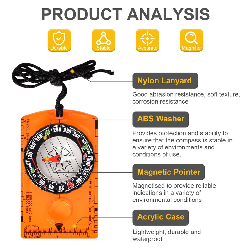 - Multi-purpose measuring scale: it has an integrated scale for distance measurement and a slotted hole for convenient attachment to cables or equipment. Whether navigating maps or planning trails, this compass provides you with multifunctional support.