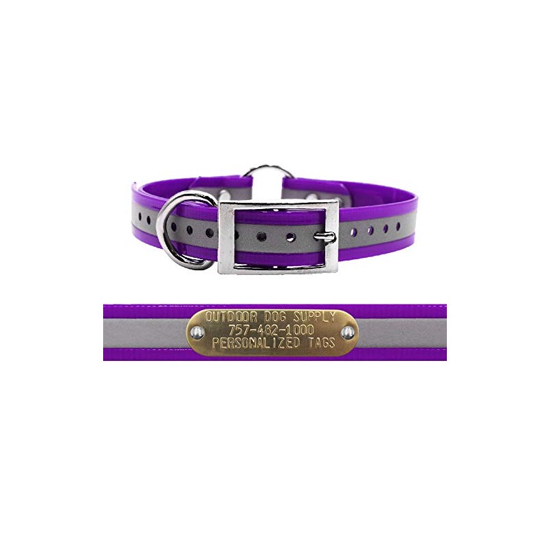 Outdoor Dog Supply's 1" Wide Reflective Ring in Center Dog Collar Strap with Custom Brass Name Plate (21" Long, Reflective Purple)