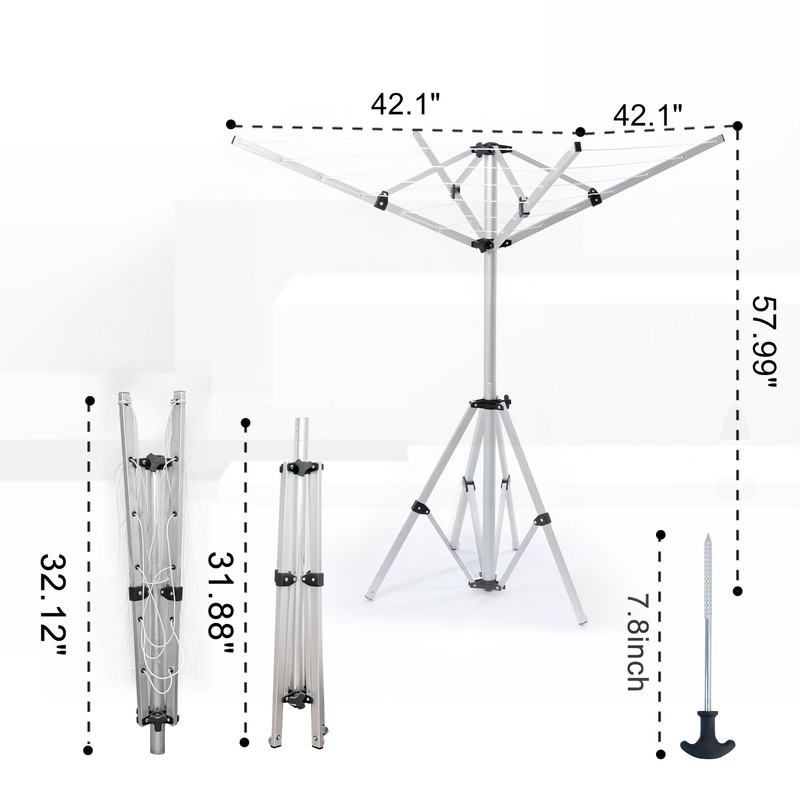 • Windproof and Anti Toppling 65 foot large capacity drying rack! Triangle bracket+ground stake double fixation, 4-arm telescopic aluminum frame, one click storage for outdoor essentials