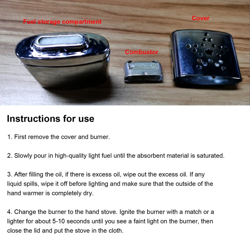 1、Made of high‑quality metal iron, low fuel consumption, very practical. 2、Easy to operate, 3 parts can be disassembled, fuel storage bin, burner and lid. 3、The high heat output allows it to be used even in extremely cold places. 4、The design is exquisite and compact, which is very convenient to carry at any time in cold weather and has strong practicability. 5、Reusable design, very suitable for outdoor hunting usage.
