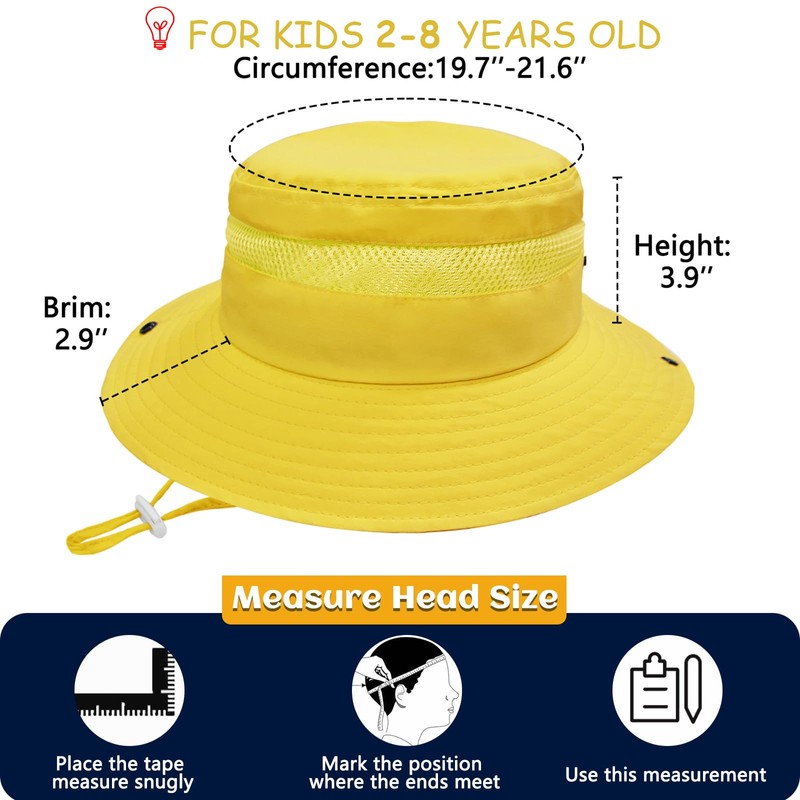 - Design: Wide brim kids bucket hat with sweat-absorbing belt and mesh air holes is very comfortable to wear, especially for energetic activities under sunlight. UPF 50+ sun protection fabric block most of damaging UV sun rays, 7.4cm/2.9" foldable floppy wide brim will help shield your kids' skin and offer extra protection