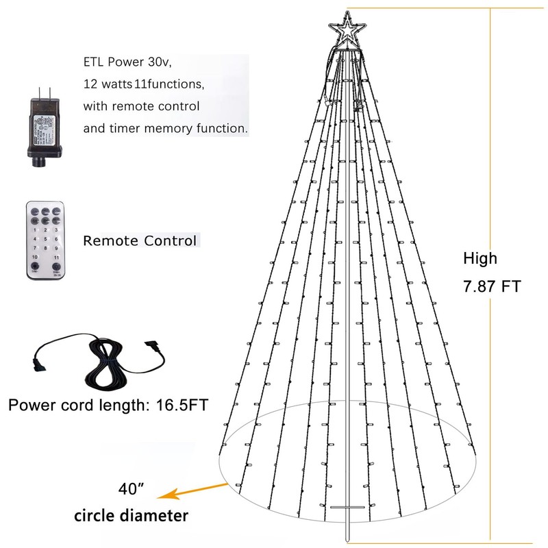 - FUNCTION MODE: The product is equipped with 30V ETL certified power supply, 12 watts 11 modes switching with remote control and three timer + memory functions. Dimmable.Universal for indoor and outdoor use, recommended to adjust the size between 5FT-7.8FT. Unique large base design, make the whole Christmas tree form a one piece sturdy and solid, Christmas tree cone light strings glow evenly up and down, the bottom ring of the luminous diameter expanded to 3.3FT.