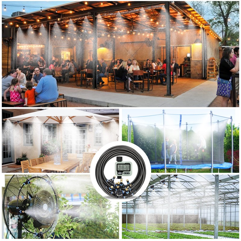 - 【DIY YOUR OWN COOLING SYSTEM】This US standard mister for outside can be used as outdoor cooling systerm for patio, fan, umbrella, porch, pergola, vestibule, animals, or use as garden irrigation kit. Cools the surrounding air temperatures up to 20℃ or 68℉.