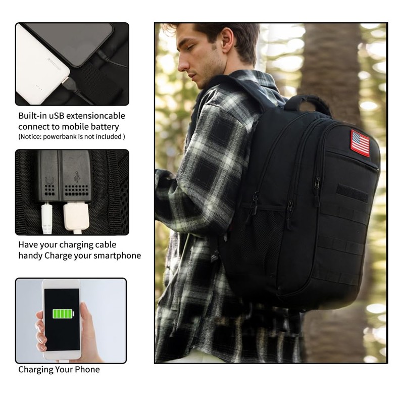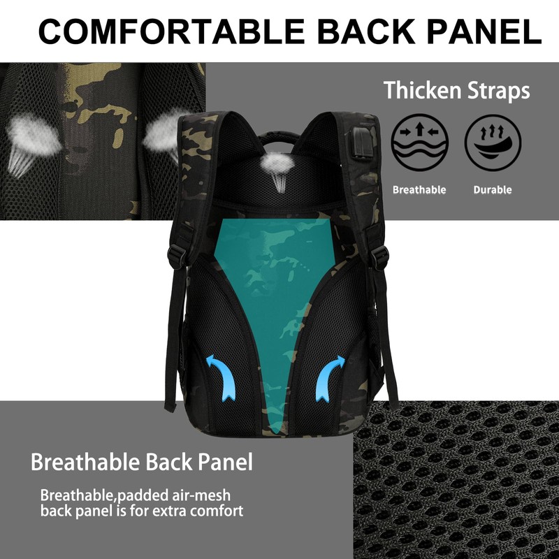 - Camo Backpack with USB Charging Port:There are double ports on the belt:USB port with built-in charging cable provides a more convenient and easier way to charge your phone. A headphone jack side-by-side with USB port offer a better way to listen your music.So it can free your hands, easy in travel,outdoor events