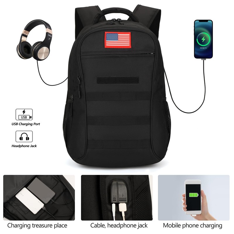 - Camo Backpack with USB Charging Port:There are double ports on the belt:USB port with built-in charging cable provides a more convenient and easier way to charge your phone. A headphone jack side-by-side with USB port offer a better way to listen your music.So it can free your hands, easy in travel,outdoor events