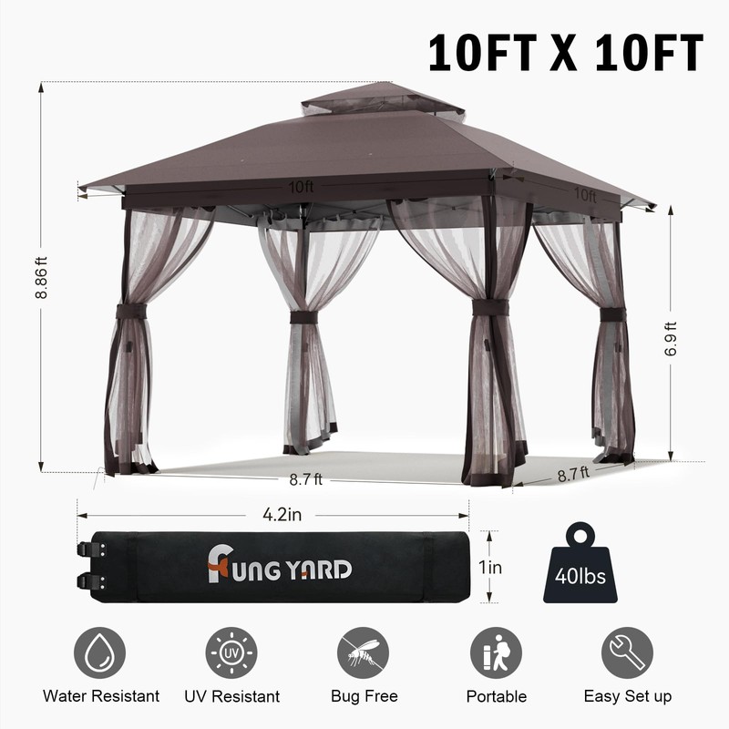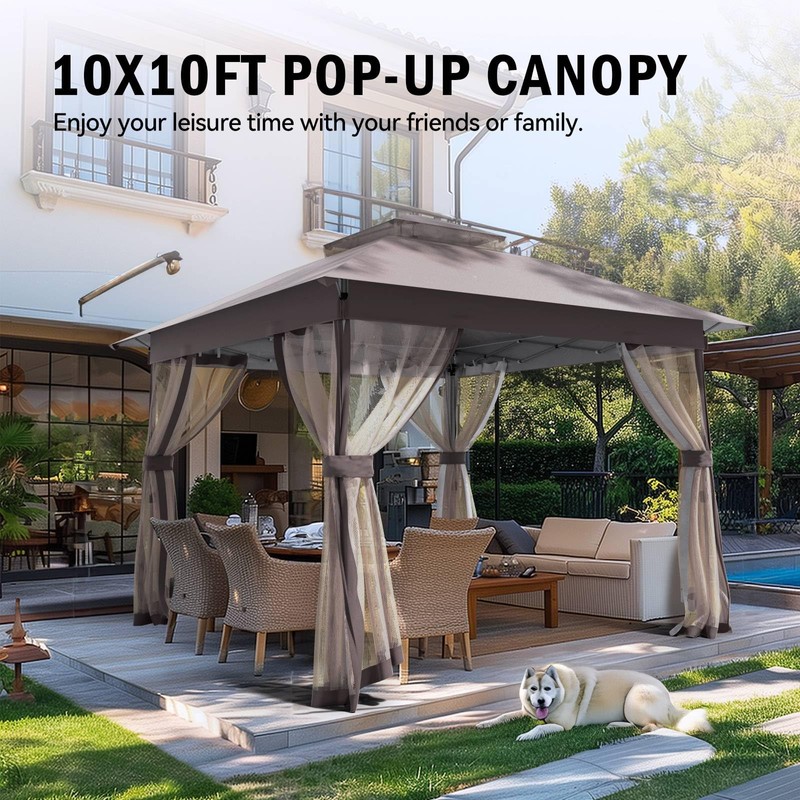 Outdoor Pop Up Gazebo 10x10 - Instant Canopy Tent with Mosquito Nettings, Double Roof Vented Gazebos Tents Shelter for Backyard Shade Party Garden Lawns (Brown, 10x10)