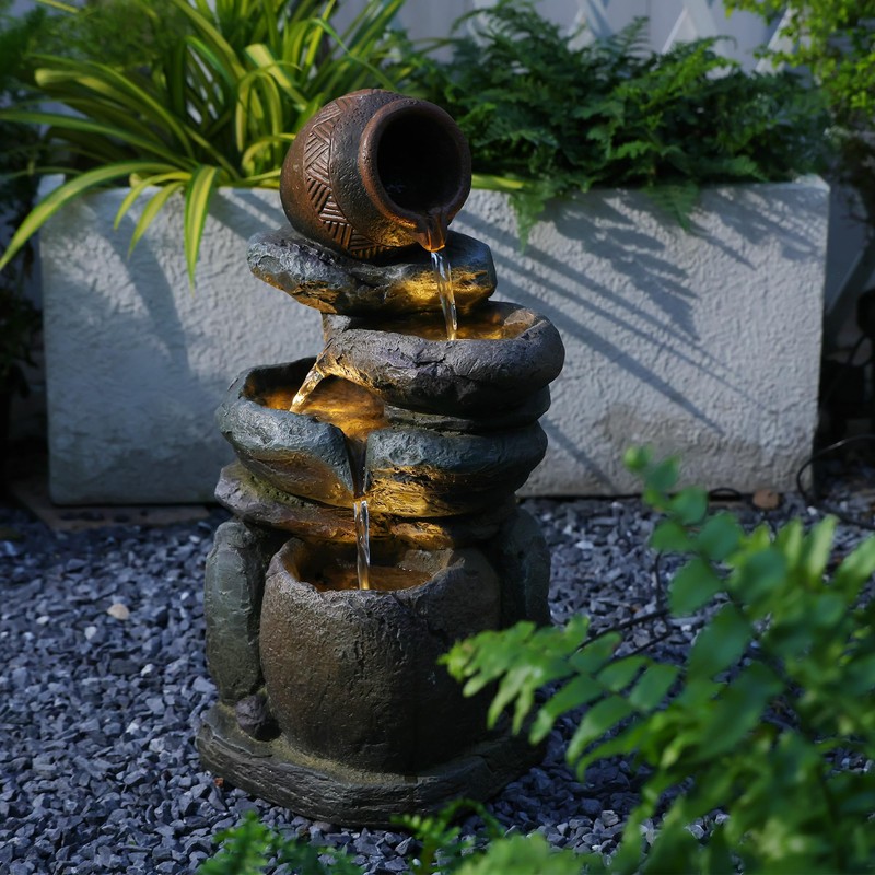 - 【Garden Fountain Information & Care】9"W x 11"D x 22"H Material: UV-stable resin Includes: Pump, LED lights, 3-tier basin system. Pro Tip: Place on a level surface near a power outlet for optimal performance!