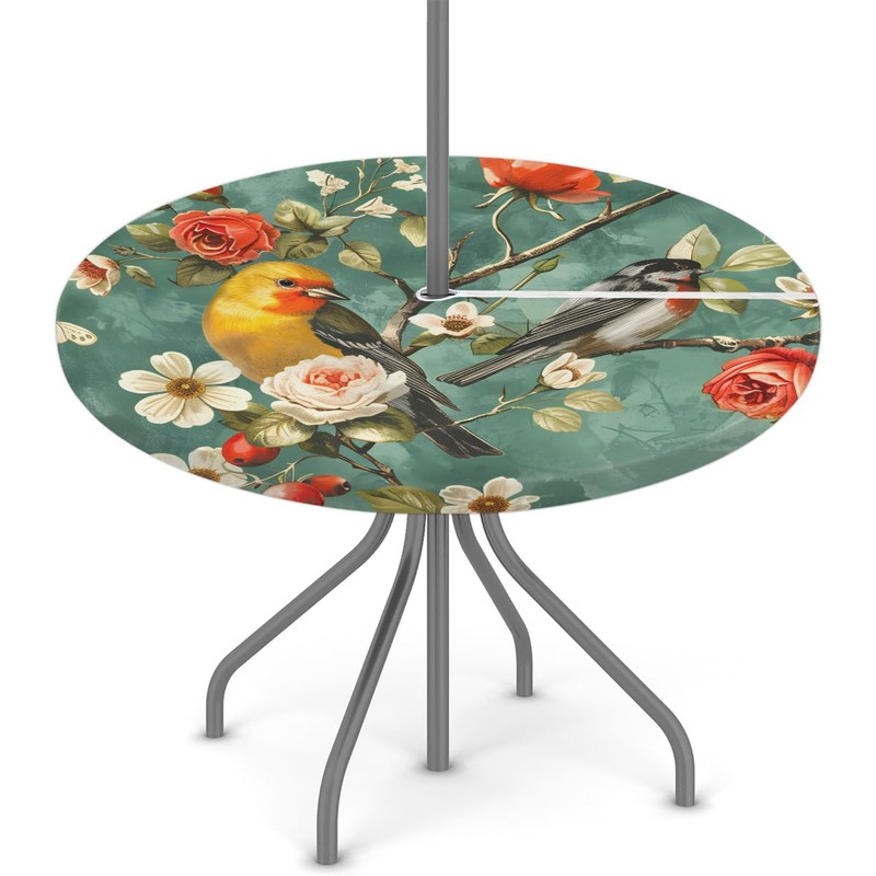 Outdoor Round Tablecloth with Umbrella Hole, Birds Flowers Outdoor Umbrella Table Cover Fitted Table Cloths with Zipper 45"-56" Waterproof Elastic Edged Patio Table Cover for Party Picnic