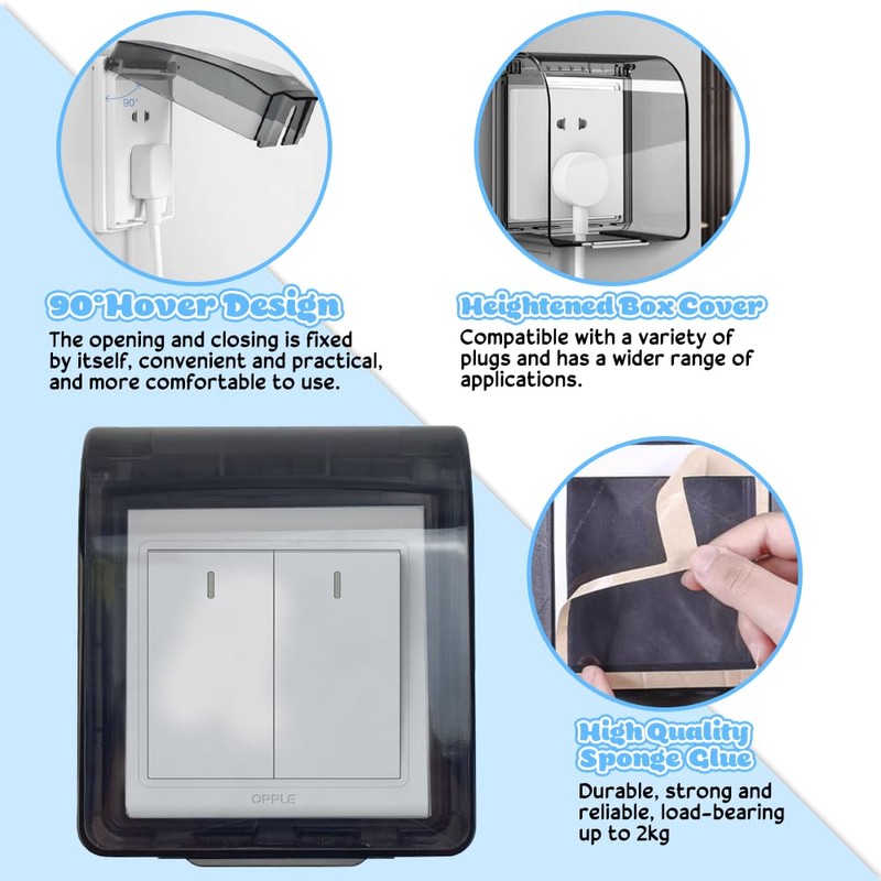 - Wide application: this waterproof socket box is suitable for protection in bathrooms, kitchens, balconies, living rooms and other places. Whether in private homes or commercial premises, it can effectively protect the socket from water vapour and dust erosion, thus extending the life of the socket.