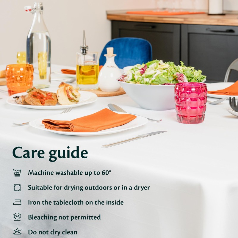 - Polyester tablecloths are extremely practical and comfortable, as they do not wrinkle and can be easily machine washed at up to 60 °C. Thanks to their durability, the tablecloths can also be air dried or tumble dried. We recommend not bleaching them and ironing on the inside to get the resin treatment stated on the label.