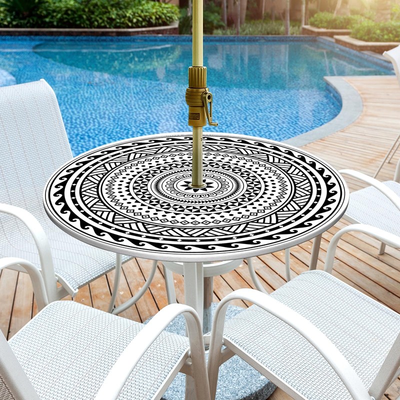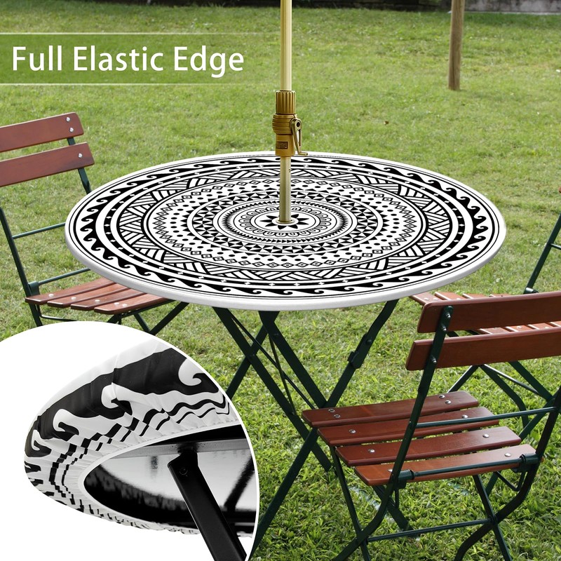 Outdoor Tablecloth with Umbrella Hole Waterproof Abstract Tribal Round Fitted Tablecloth with Elastic Zippered Table Cloth Round Cover for Picnic, Camping,Party (45''-54'')