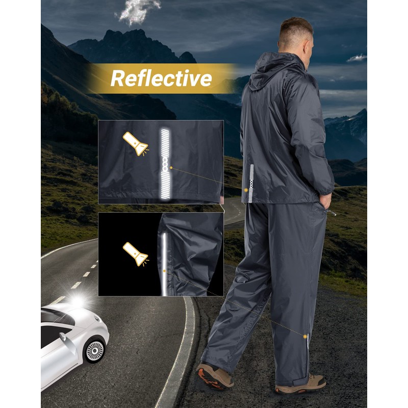 - [Safety Design] Outdoor Ventures ultra light rain jacket design the reflective piping slit on the back and the rain pants also have reflective on the legs side. It can keeps you high visibility during outdoor activities on the rainy day or night.