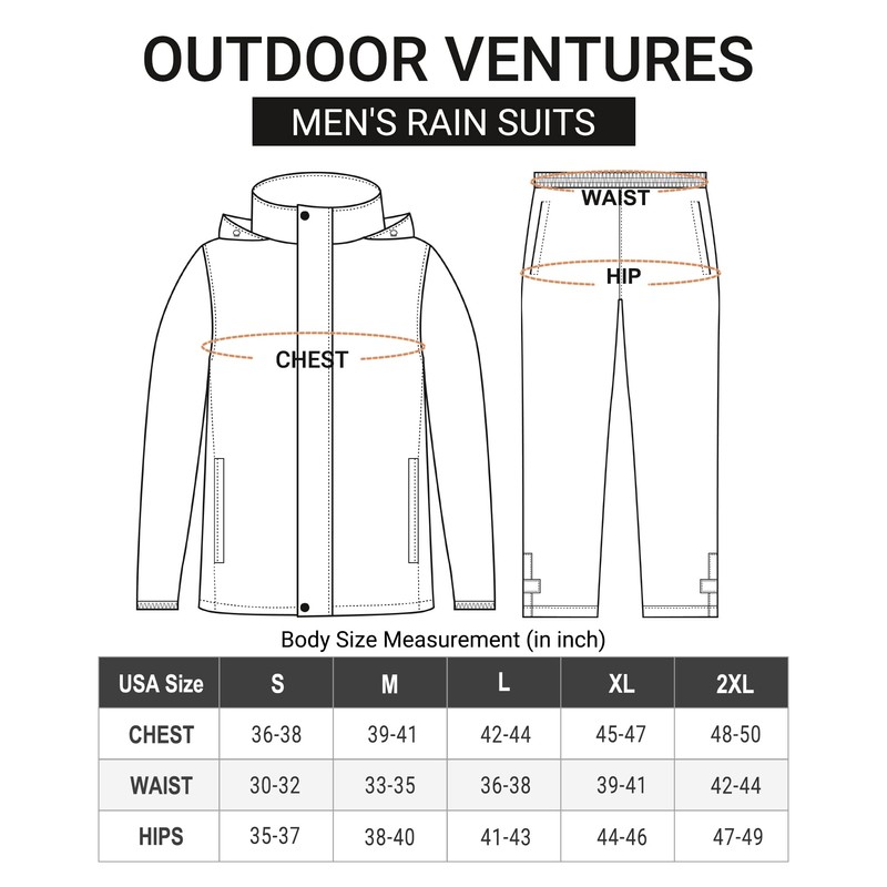 - [Keep Dry] Outdoor Ventures golf rain gear for men have packable carrying pouch can store this rain suits. And this waterproof rain jackets features elastic cuffs, adjustable drawcord hood, hem contains elastic rope to prevent yourself from being wet. Waterproof hiking pants for mens also have elasticated waistband with drawstring inside it helps you customize your fit around waist.